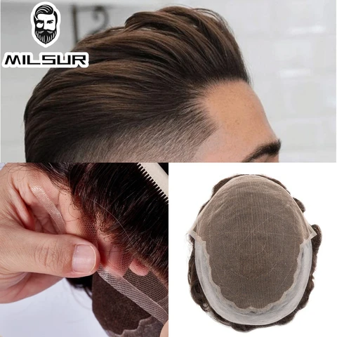 Q6 Toupee For Men Lace & PU Base Human Hair System Unit Toupee Wig For Men Durable Male Hair Prosthesis Men's Wigs