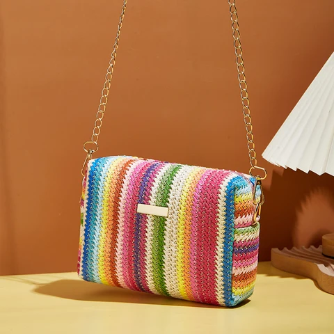 Rattan Knitting Women Straw Bag Beach Summer Chain Small Purse and Handbag Female Shoulder Crossbody Bags Travel Design Flap Bag