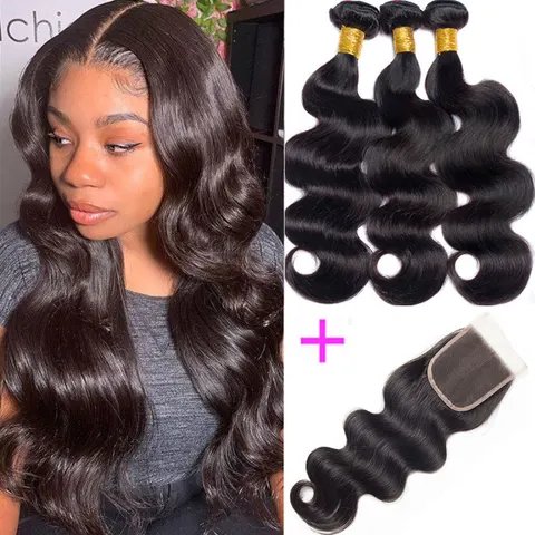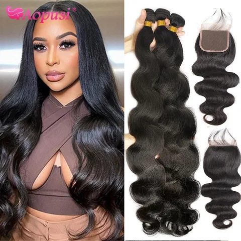 Aopusi Body Wave Bundles With Closure Indian Human Hair Bundles With 4x4 Lace Closure Human Hair Weave Extensions 3/4 Bundles