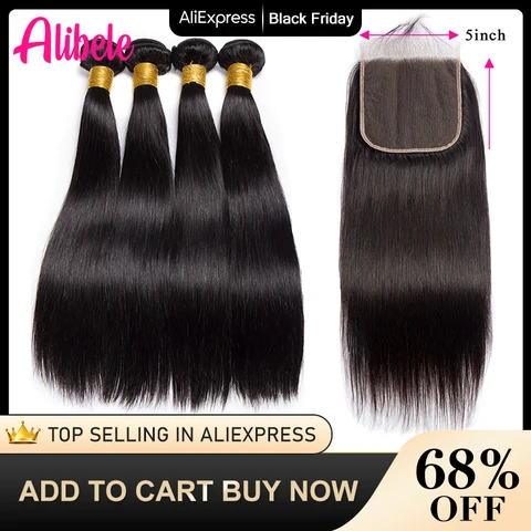 Alibele 5x5 HD Lace Closure With Bundles Peruvian Straight Bundles 10-30 Inch Long Human Hair Weave Bundles With 4x4Lace Closure
