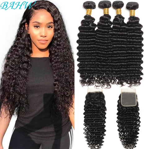 Deep Wave Human Hair Bundles With Closure Brazilian 4X4 Transparent Lace Closures With Bundles 3/4 Bundles Hair Weave Extension