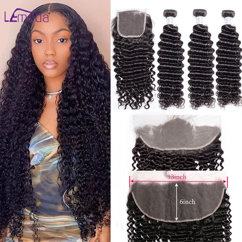 Curly Wave Human Hair Bundles With Closure HD Transparent Lace Frontal With Bundles Deep Wave Remy Hair Weave Extensions