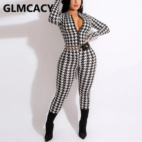 Women Houndstooth Printed Long Sleeve Zip Up Slim Jumpsuit Elegant Chic Overalls