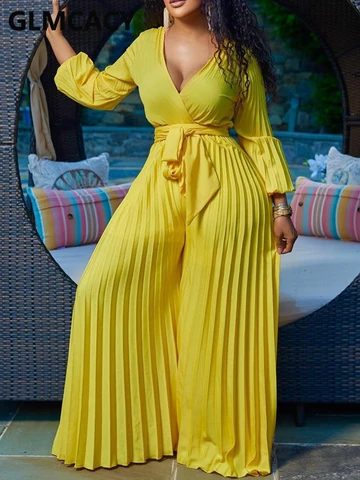 Women Elegant V Neck Pleated Jumpsuit Casual Wide Leg Loose Overalls