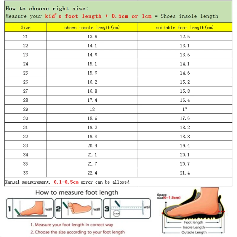 2. Please choose the suitable shoe size according to your childern’s foot length.