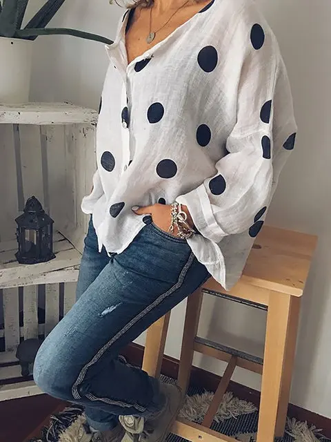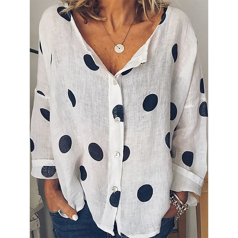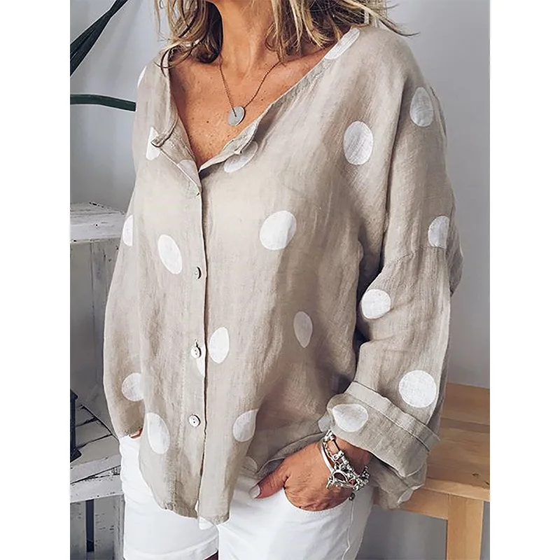 Fashion Design Polka Dot V-neck Long Sleeved Plus Size Loose Casual Top Print Linen Fabric Shirt Women Blouse