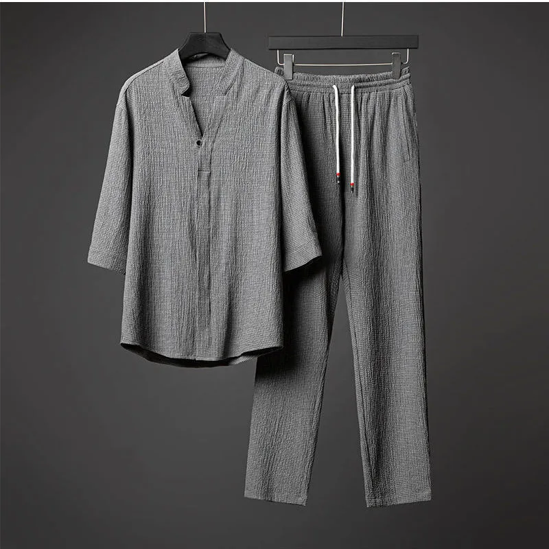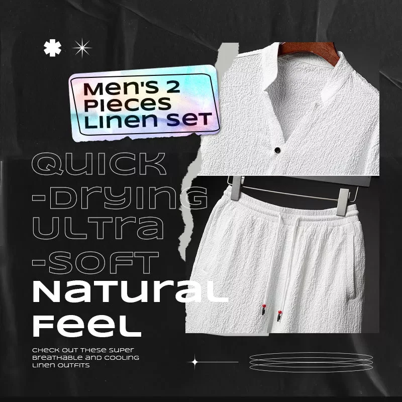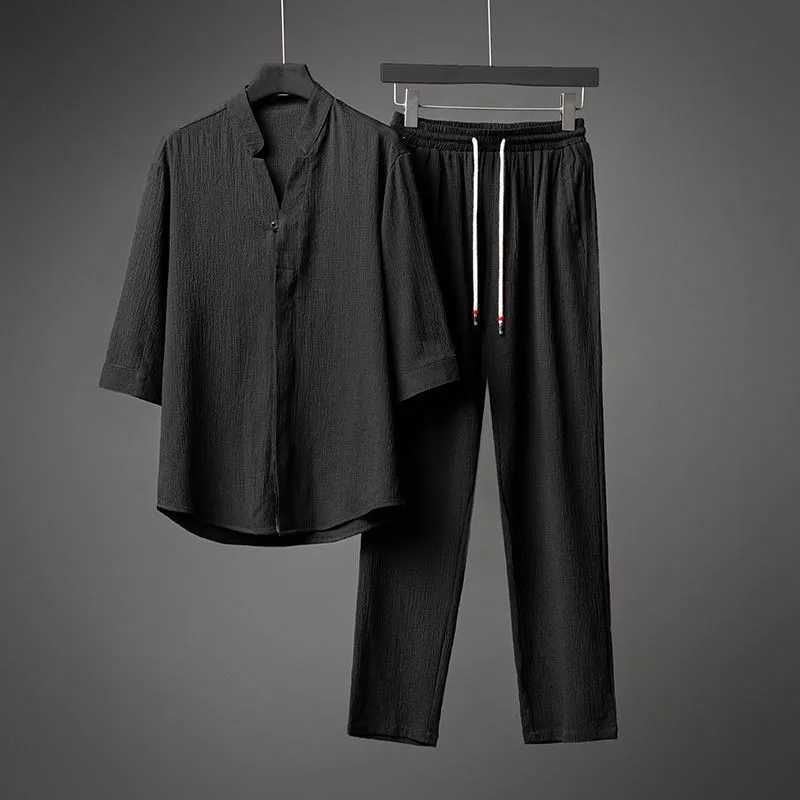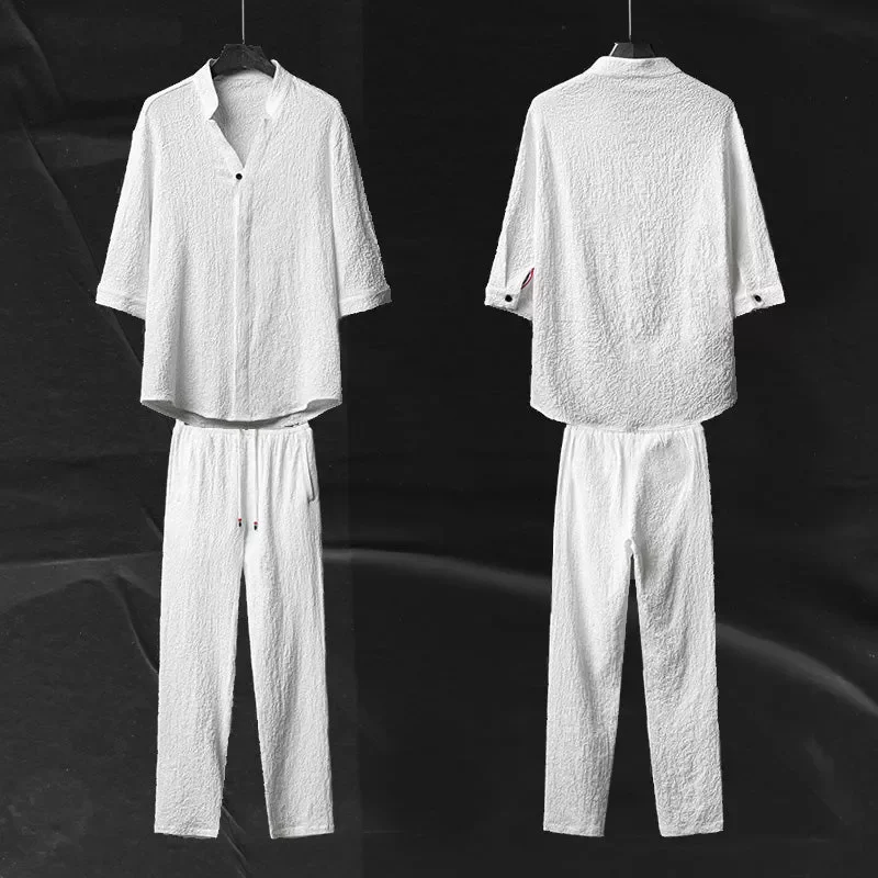 Men's 2 Pieces Linen Set Summer Outfits Ice Silk Linen Two Piece Suit Summer Thin Short Sleeve T Shirt Plus Size Trousers